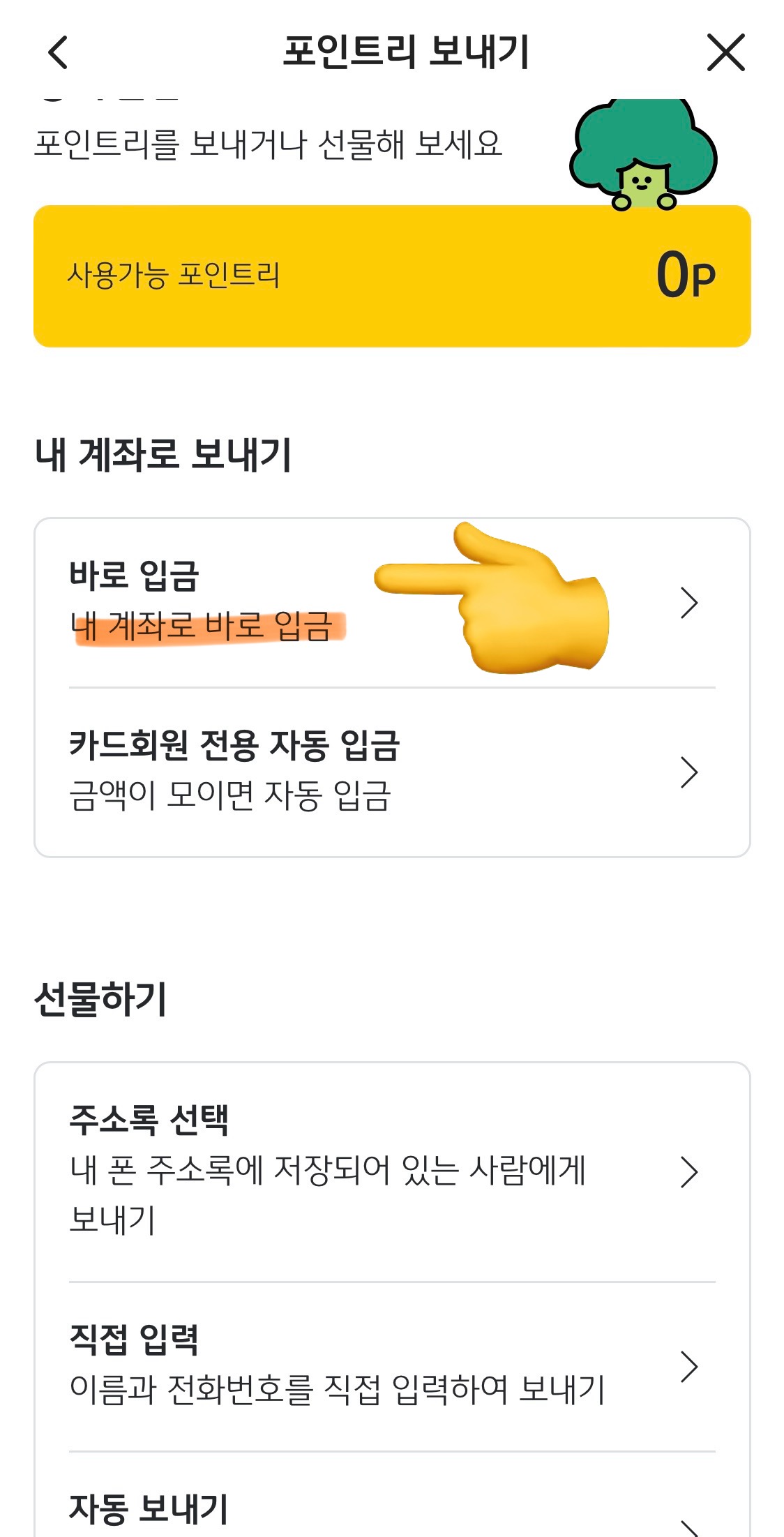 포인트리 보내기에서 바로 입금을 누르면 내 계좌로 바로 입금이 가능한 모양이다.
