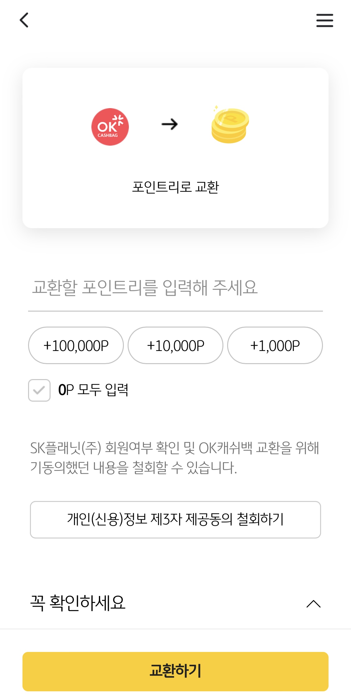 포인트 전환을 위해 개인정보 제3자 제공동의를 누르고 교환하기를 누르면 끝!